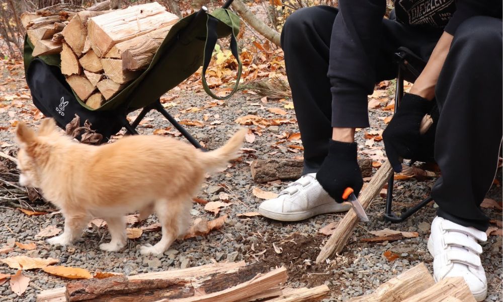 薪はキャンプ場で購入し、YouTubeで学んだ「バトニング」や「フェザースティック」にもチャレンジ。
