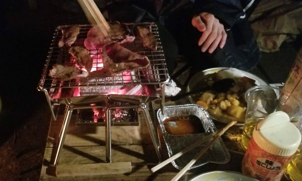 → テント内のお座敷は、食事やくつろぎの時間がぐっと快適に。横になって景色を楽しめる贅沢感は一度味わうとやみつきに。荷物は増えるが、その価値は十分あり。 - 地元食材でキャンプ飯がワンランクアップ