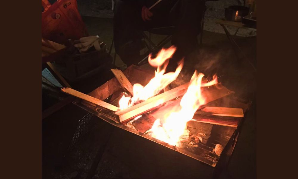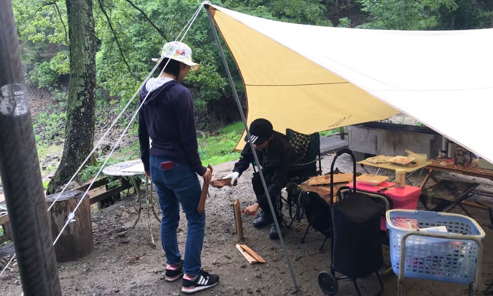お酒片手に焚き火を楽しみ、雨音を聞きながらタープの下でのんびりと過ごしました。