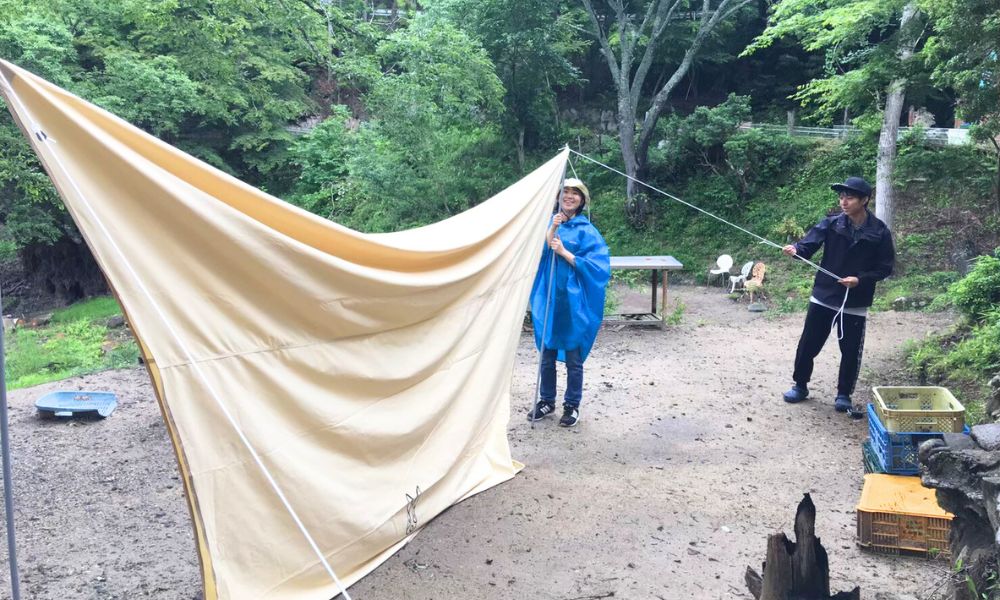 今回のキャンプで特に役立ったのが「タープ」です。日差しを避けるための印象が強いですが、雨風をしのぐシェルターとしても大活躍しました。