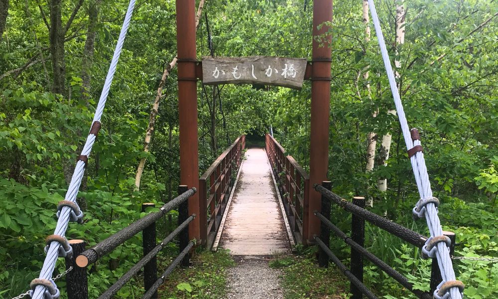 キャンプ場から歩き始めると、吊り橋やゆるやかな坂道が続きます。途中には休憩できるトイレもあるので安心。