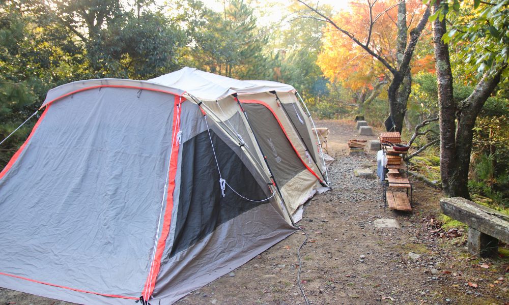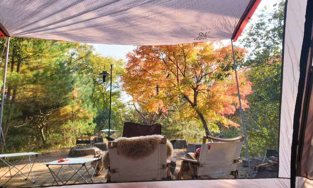 テントの前面を跳ね上げると、ちょうど紅葉が広がっていて景色を存分に楽しめます。