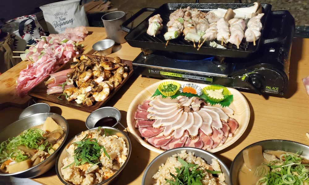 炊き込みご飯のほかにも鳥のたたきや焼き鳥、お酒も用意して、ゆったりと過ごす時間が最高。