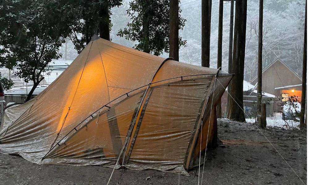 夜には雪がさらに強まり、テントが白く染まっていく様子も印象的。