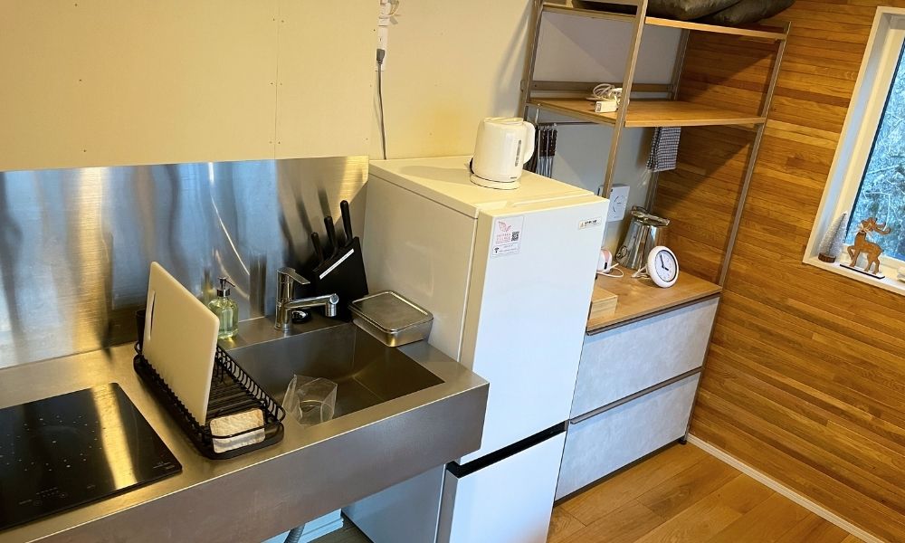 トレーラーハウス内にはミニキッチンが設けられています。IHコンロ、冷蔵庫、シンク、電気ケトルが備え付けられており、包丁・まな板・各種食器も用意されています。