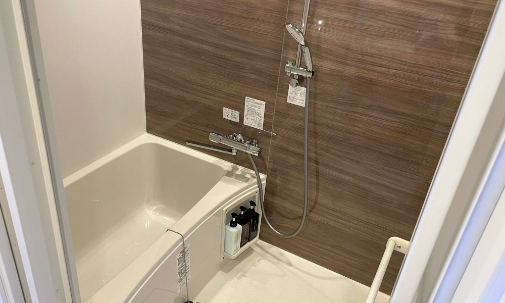バスルームには浴槽とシャワーが備えられており、一般的な宿泊施設と同様の仕様です。広めの浴槽で、ゆったりと入浴できます。