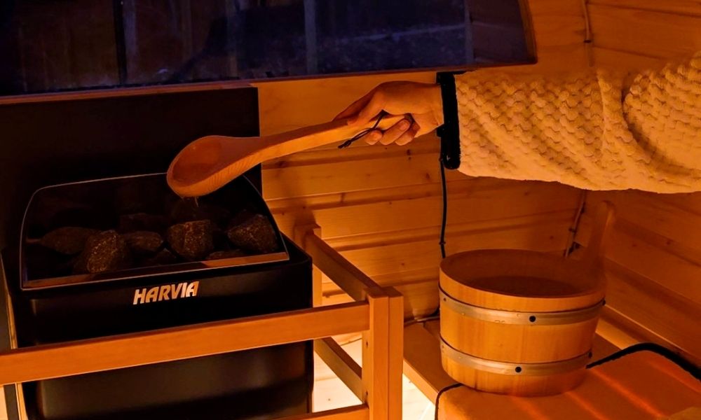 温度は80℃前後で、水をかけることで蒸気が発生し、体感温度を調整できる仕様です。ロウリュウを行うと一気に熱が立ち上がり、短時間でも十分に発汗できます。