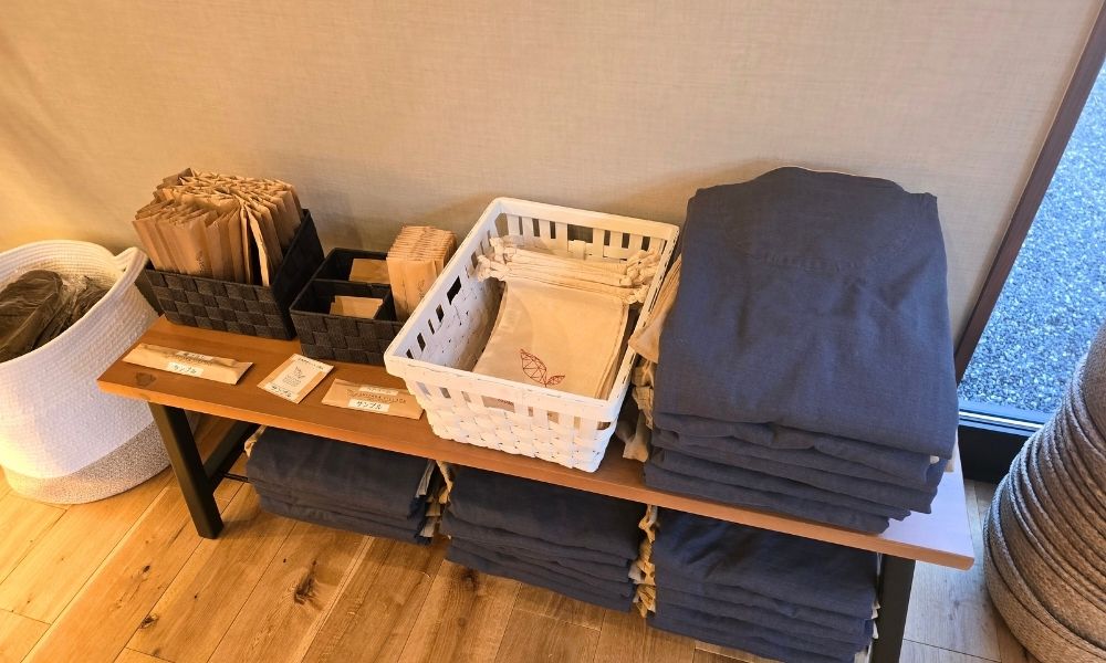 受付横にはアメニティコーナーがあり、部屋着や歯ブラシなどを必要分だけ選ぶスタイルです。