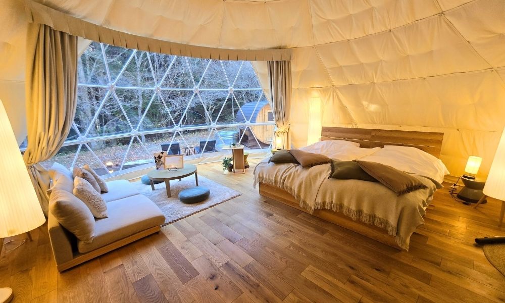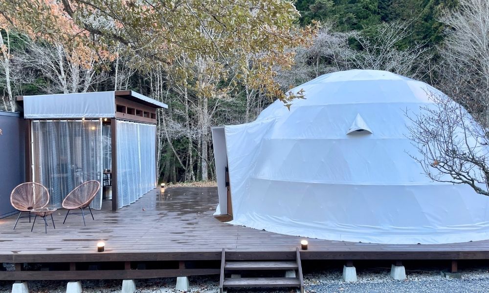 客室はドーム型のテントタイプで、定員は4名。丸みのある外観は自然の景色にも馴染みやすく、森の中に静かに佇んでいるような印象でした。