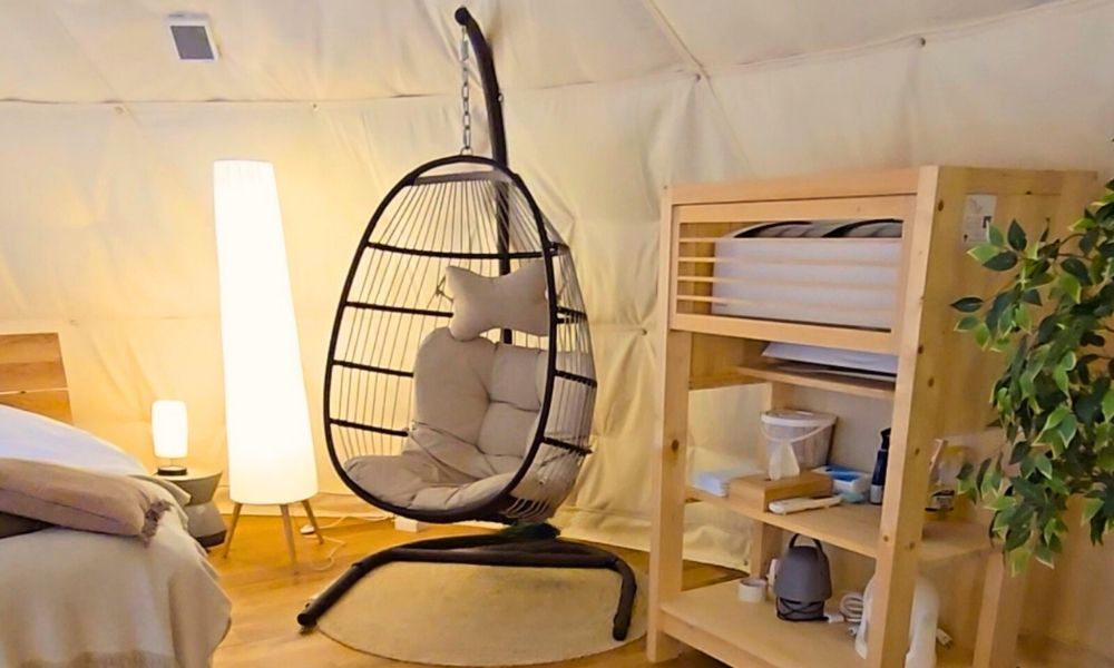 室内にはハンギングチェアも設置されており、ゆったりとくつろげる空間づくりがされています。